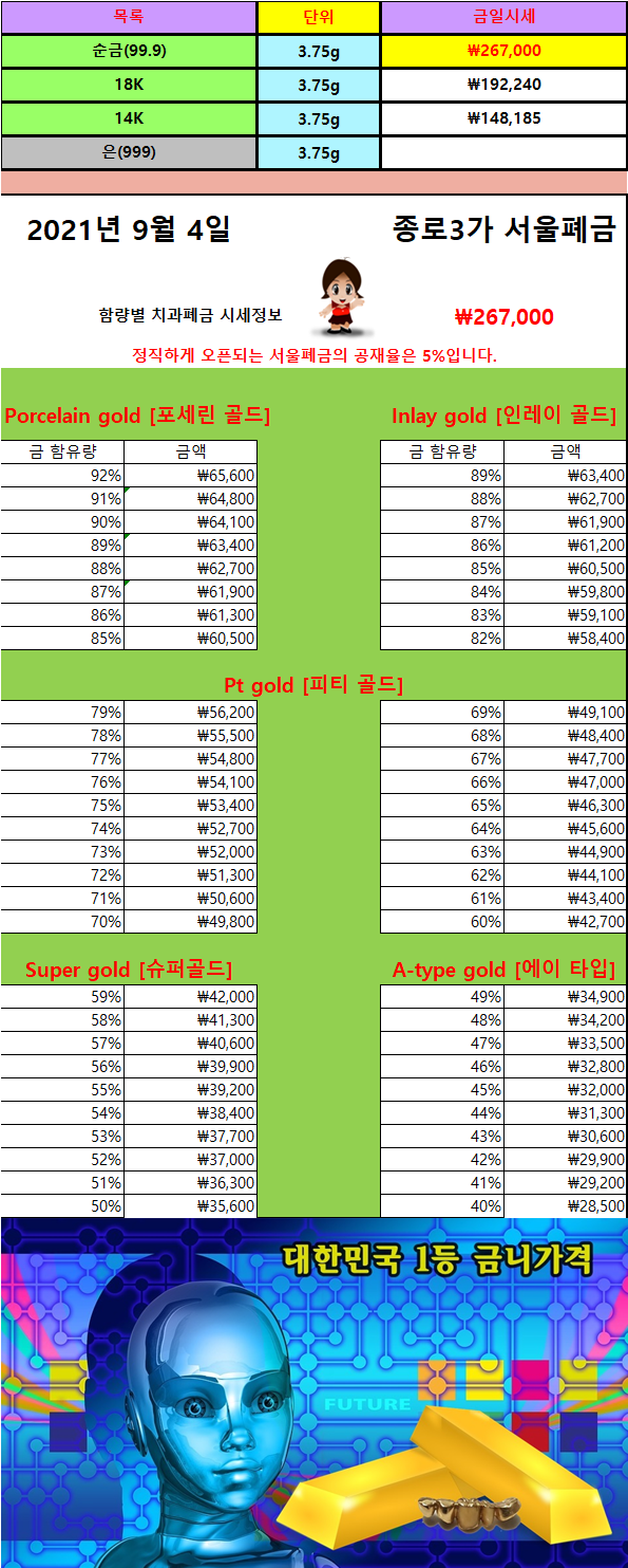 | 9/ 9 금니가격/ 금니팔기/ 금니매입 (0) | 2021.09.09 |