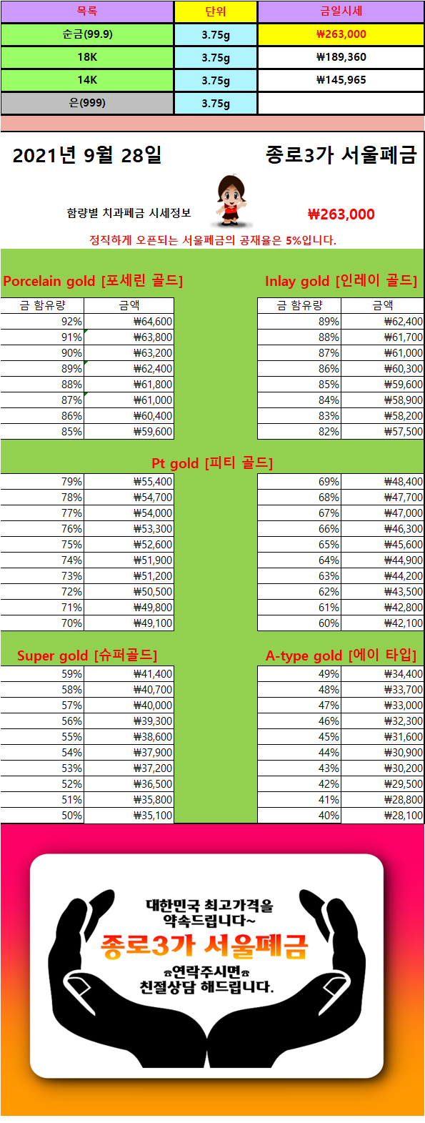 | 9/ 16 금니가격/ 추석연휴 서울폐금 영업시간 안내 (0) | 2021.09.16 |