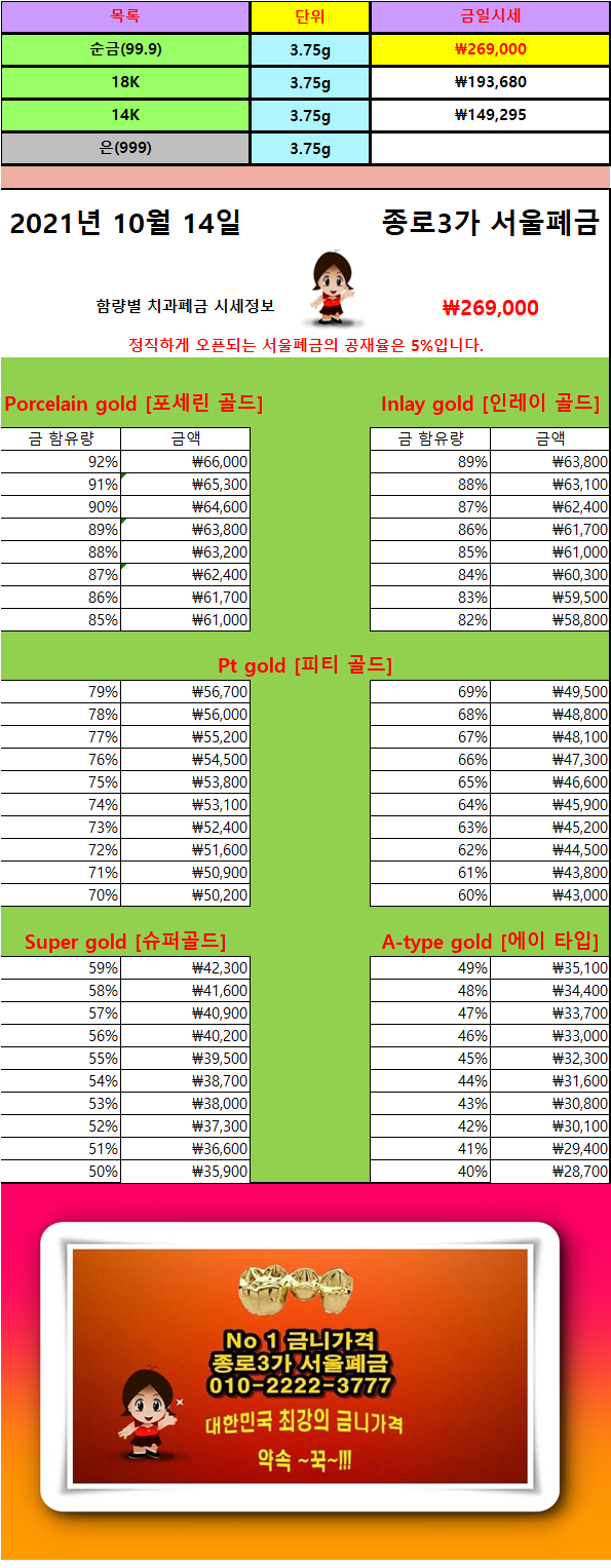 | 10/ 16 금이빨시세/ 금이빨가격 1등가격 보장 ~!! (0) | 2021.10.16 |