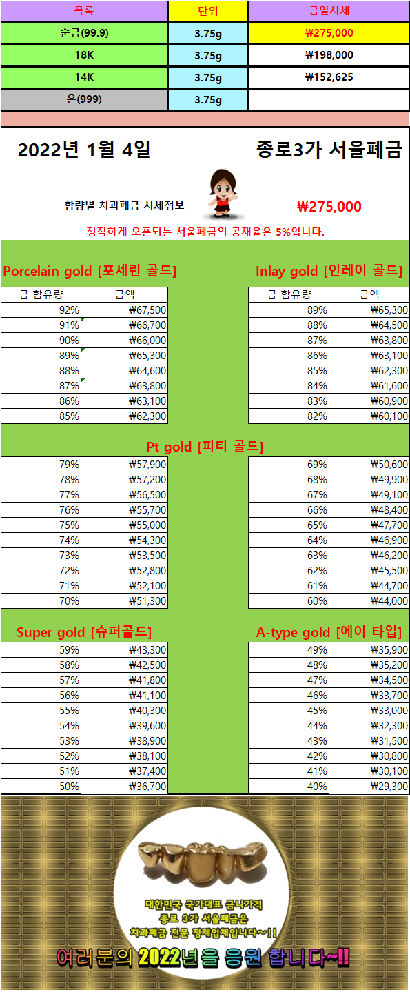 | 12/ 23 2022년은 치과금니 더 좋은 가격을 위해 노력 경주 하겠습니다. (0) | 2021.12.23 |