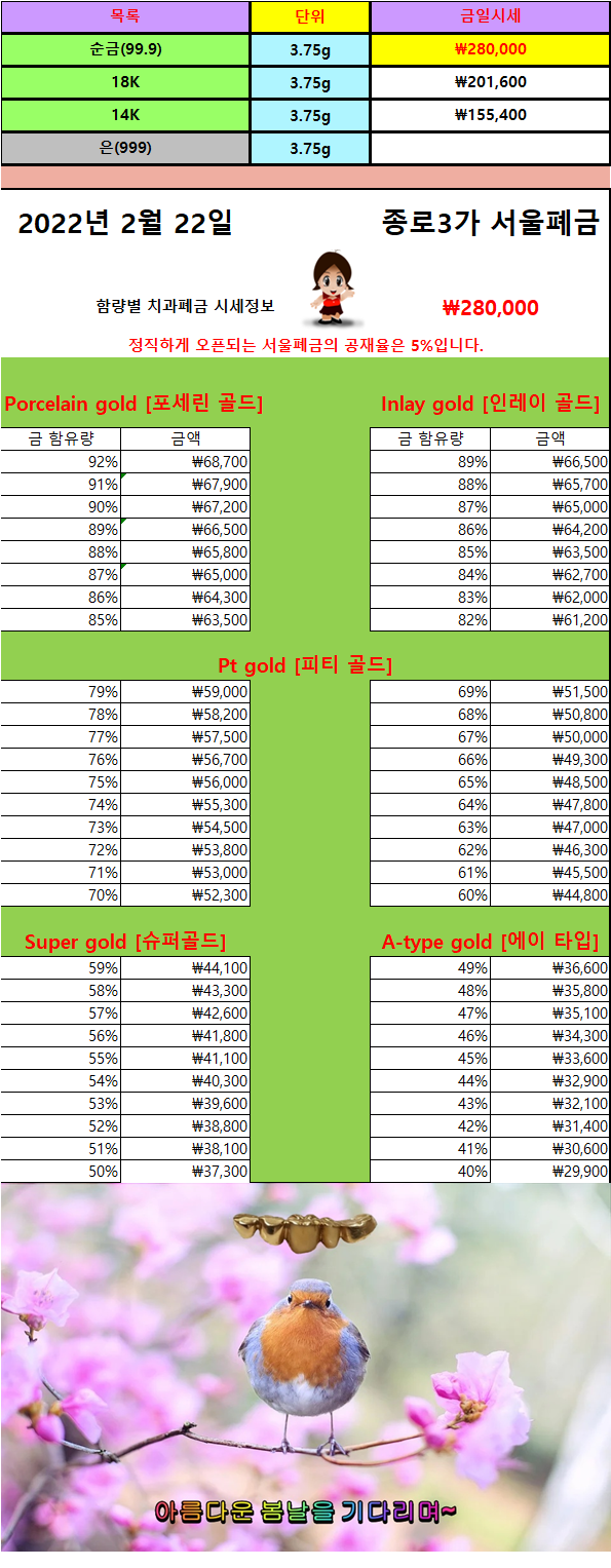 | 3월 3일 치과금니가격/ 치과금니시세 (0) | 2022.03.03 |