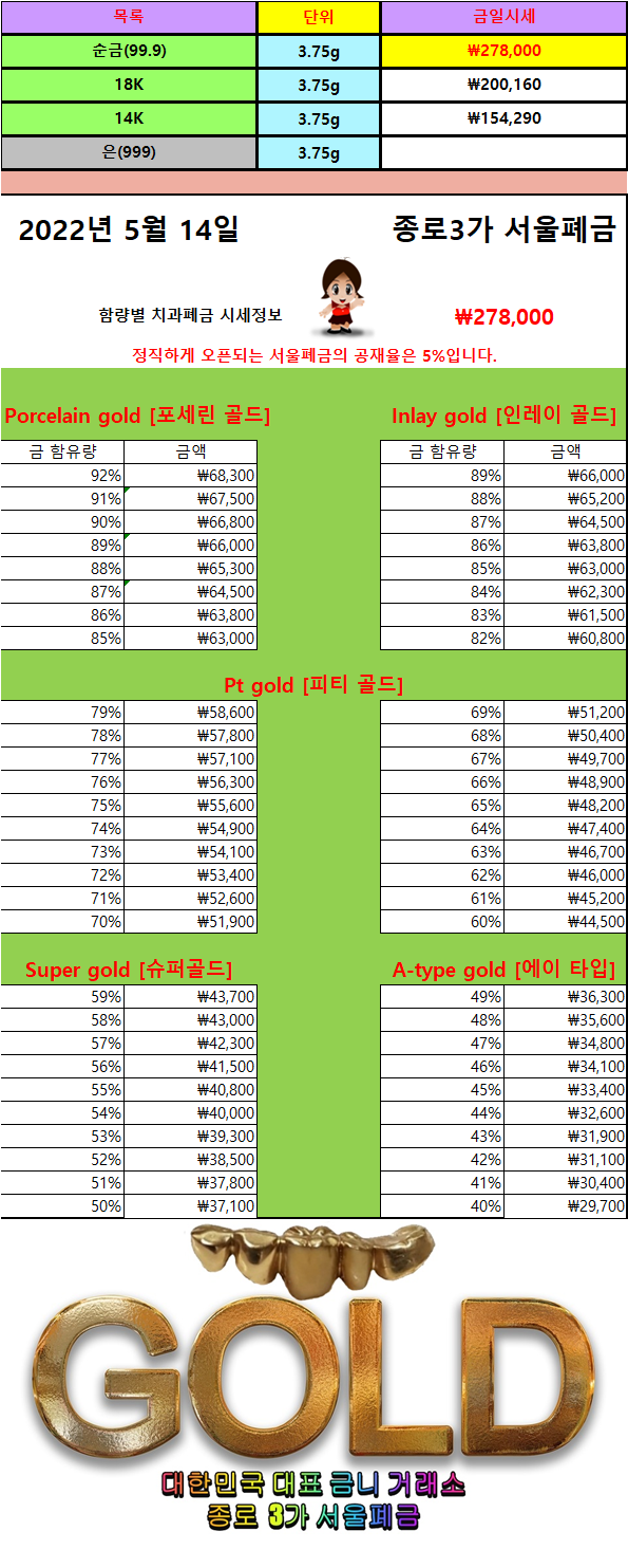 | 치과금니 시세 5월 5일 열심히 영업합니다~! (0) | 2022.05.05 |