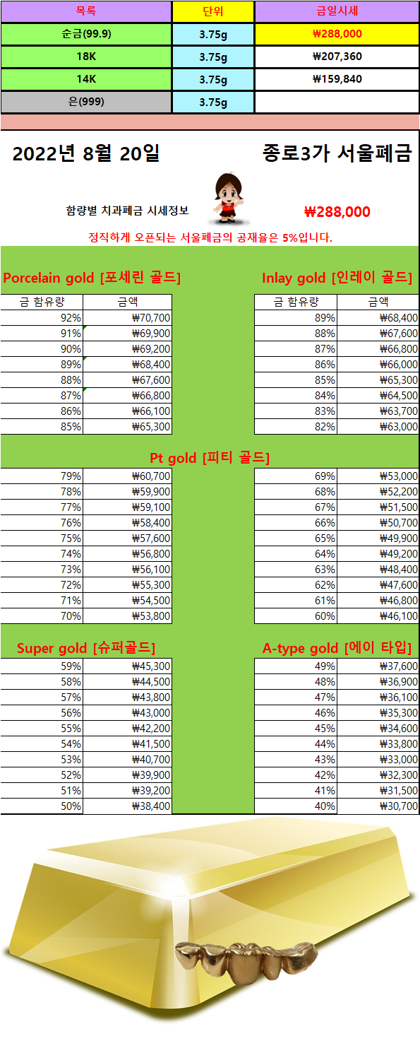 | 최고가격에 알찬 금이빨 판매 8월 25일 금이빨 가격 (1) | 2022.08.25 |